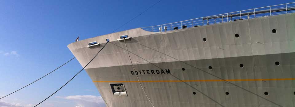 We looked forward to the first item on our list—an opportunity to revisit an old friend, the ss Rotterdam. The very first cruise we ever took— the vacation where we realized how much we would enjoy cruising—was a week's adventure in the Caribbean on this very ship. Some 25 years later, the old, but still-beautiful ss Rotterdam is berthed in the city for which it was named, serving as a reminder of its past glory and as a modern, fully-equipped hotel. After pondering the many ways that we could travel to its pier to pay a short visit, we decided that the easiest thing was to just ask the cab driver we'd get at the Ryndam cruise terminal to make a stop for us at the Rotterdam berth and wait for us. This worked out very well; the driver was co-operative, and even though it was quite early in the morning for the Rotterdam staff to welcome visitors, once we explained why we were there the hotel desk was very gracious in allowing us to wander about as we wished. We noticed that the beautiful wood is still in place through at least part of the ship, and that at least some of the artwork for which the ship was noted during its sailing days is there as well. When I stepped out onto the promenade deck—so different from Holland America's current promenade decks which are covered, for the most part, but exposed to the open sea air, and featuring beautiful teak flooring and railings—I realized that I'd forgotten how this area looked on the old ss Rotterdam. We'd both walked laps and laps around this old deck, as we do today on the newer ships, but somehow its appearance had escaped my memory.