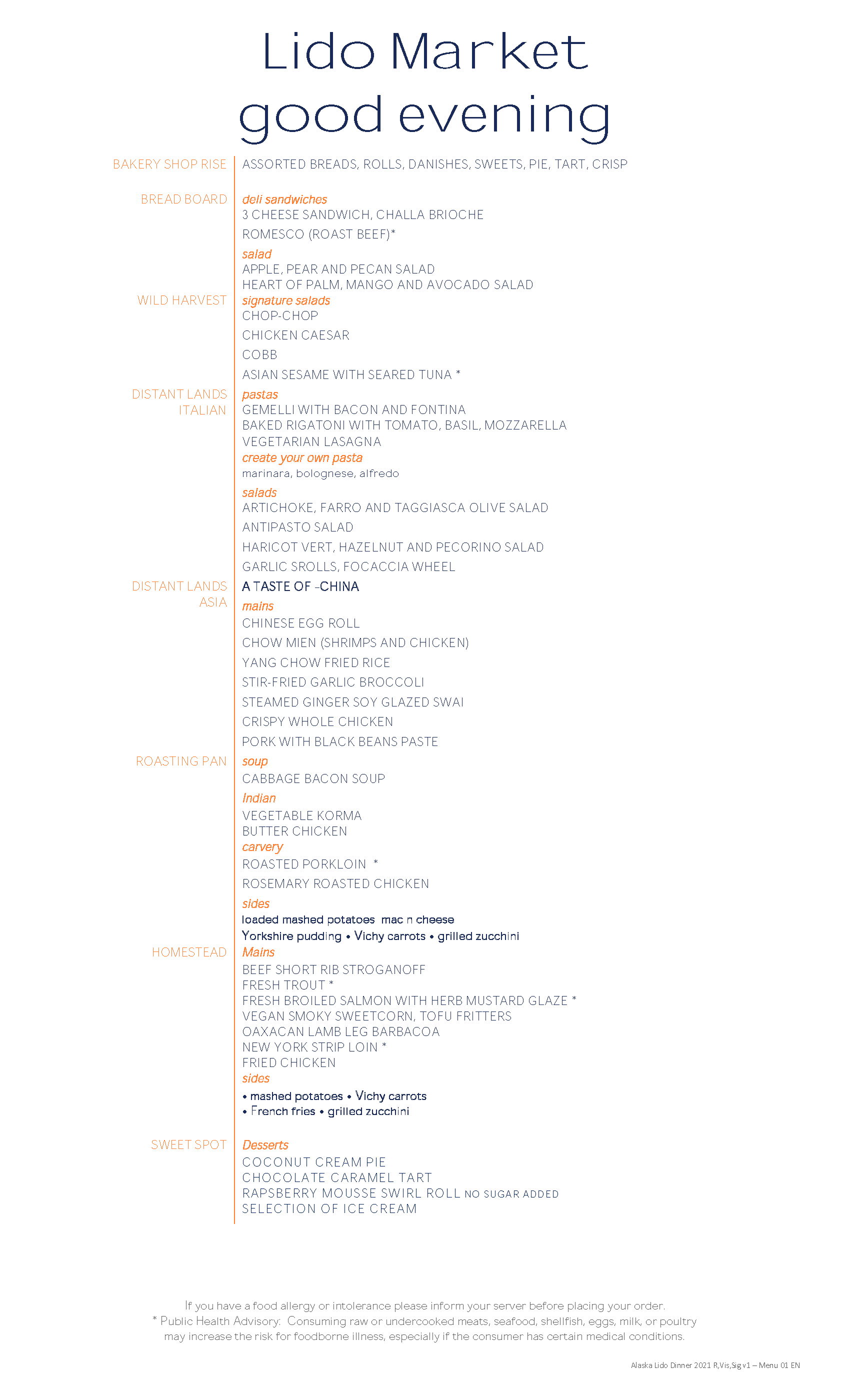 The Lido Market provides cafeteria style dining on the Lido Deck. Guests make selections at multiple stations located in the center of the Lido Market. Nearly identical stations are located on both the port and starboard side, with seating located near the windows. These stations include Rise, Breadboard, Wild Harvest, Distant Lands (Italian and Asian) Roasting Pan, Homestead, and Sweet Spot. The food selections at these stations are extensive and provide selections that meet the needs of most cultures and diets. However, the names of the stations are a little confusing, and do not always reflect what is being served at the individual stations. You may have to visit multiple stations to get all the items you want to eat, but after a few visits you do get the hang of it.