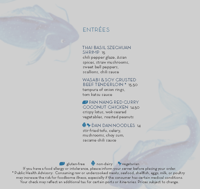 The Tamarind is open for Dinner with added cost of $35 per person. Mariner and package discounts apply. Selected items on menu are additional cost. An 18% service charge is automatically applied.