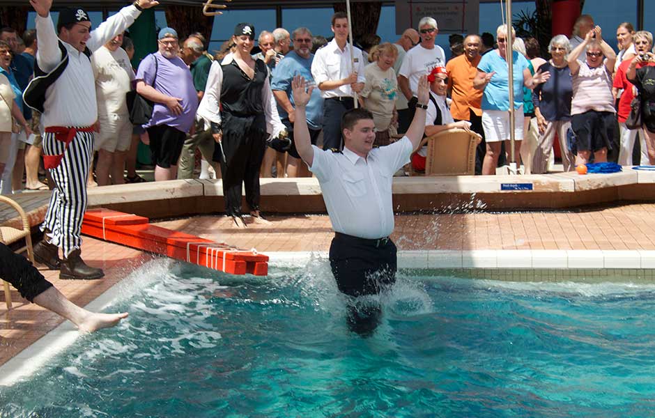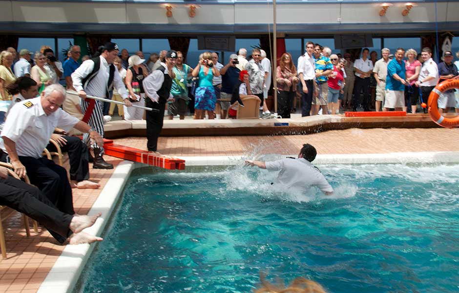 Another sea day special! Many departments went all out to create a game or contest for all of us to enjoy. There were games of chance, skill contests, guessing games, and in the center ring (the Lido pool) passengers were using their game tickets—delivered to our cabins and more could be earned with luck and skill at the fair—for a chance to toss a ball through a series of life buoys suspended at various heights over the pool. Those who scored a ball through the hoop got to see an officer "walk the plank" into the pool, and the highest ring earned a pool jump by the highest-ranking officer playing the game at that time. At the end of the time allotted for the fair the line was still long for participating, so the game was extended and Cruise Director Anthony Choice joined the lineup as the highest-ranking plank-walker. Everyone had a lot of fun, watching and playing the little games and the crew went to a lot of trouble to offer a morning's entertainment for all of us.